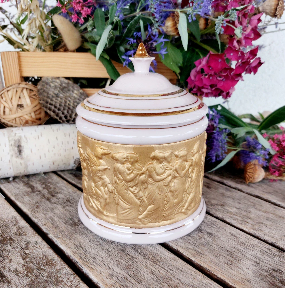 Elegantní dóza na cukrovinky vyrobená ručně z růžového porcelánového střepu, jehož výrobou chodovská porcelánka proslula. Je zdobená lesklými zlatými proužky a antickým motivem z matného zlata.