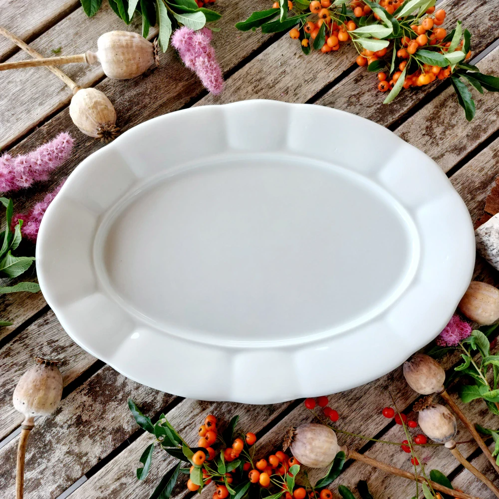 Bílý oválný podnos na servírování. Vyrobený ze silnostěnného porcelánu v prvorepublikovém stylu. Pohled na tento porcelán vyvolává vzpomínky na pečenou kachnu od babičky. Tato kolekce je primárně vyrobena pro zátěžové stravovací provozy jako jsou např. hotely a restaurace. Díky kvalitní glazuře a vysoké teplotě pálení (1400 °C) vyniká mimořádnou odolností proti otlukům.