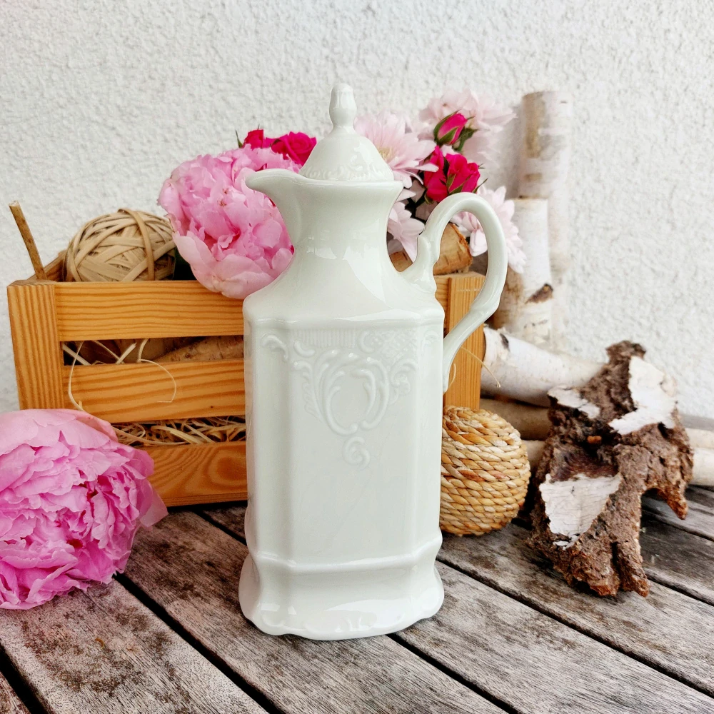 Praktická vysoká dóza s víčkem na ocet nebo olej z porcelánu barvy slonové kosti od největšího českého výrobce porcelánu Thun 1794. Kolekce Bernadotte je snad nejznámější a nejpopulárnější reliéfní porcelánový soubor, který se v Lesově vyrábí od 60tých let 20. století. Důkazem je, že je kolekce velmi rozsáhlá a její sortiment se neustále rozšiřuje dle požadavků trhu. Tento výrobek nemá spodní značku výrobce.