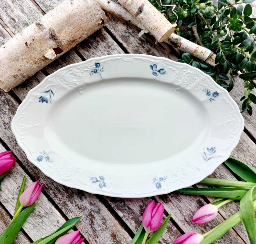 Praktická velká oválná mísa / podnos z porcelánu barvy slonové kosti dekorovaná modrými květinami od největšího českého výrobce porcelánu Thun 1794. Kolekce Bernadotte je snad nejznámější a nejpopulárnější reliéfní porcelánový soubor, který se v Lesově vyrábí od 60tých let 20. století. Důkazem je, že je kolekce velmi rozsáhlá a její sortiment se neustále rozšiřuje dle požadavků trhu.