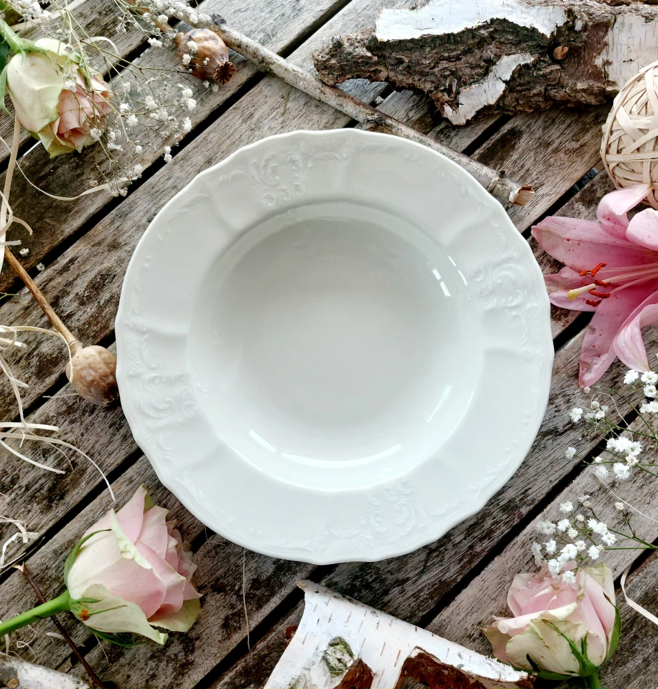 Klasický hluboký talíř na servírování polévky v barvě slonové kosti od největšího českého výrobce porcelánu Thun 1794. Kolekce Bernadotte je snad nejznámější a nejpopulárnější reliéfní porcelánový soubor, který se v Lesově vyrábí od 60tých let 20. století. Důkazem je, že je kolekce velmi rozsáhlá a její sortiment se neustále rozšiřuje dle požadavků trhu. Tento výrobek nemá spodní značku výrobce.
