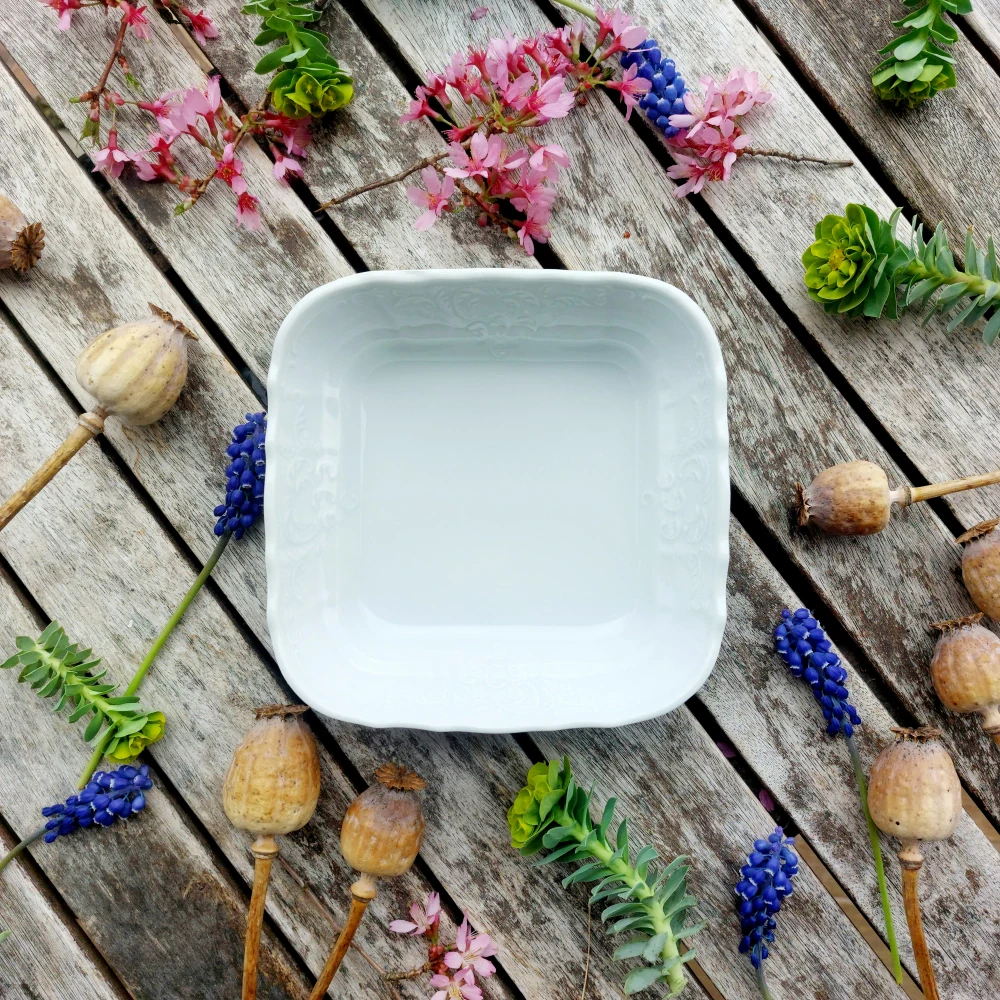 Praktická čtyřhranná miska na kompot, polévku nebo salátek z bílého porcelánu od největšího českého výrobce porcelánu Thun 1794. Kolekce Bernadotte je snad nejznámější a nejpopulárnější reliéfní porcelánový soubor, který se v Lesově vyrábí od 60tých let 20. století. Důkazem je, že je kolekce velmi rozsáhlá a její sortiment se neustále rozšiřuje dle požadavků trhu. Tento výrobek nemá spodní značku výrobce.