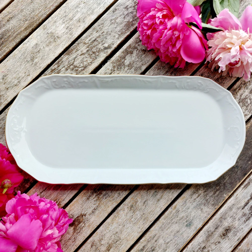 Elegantní čtyřhranný podnos na závin v bílé barvě zdobený zlatou linkou na okraji od největšího českého výrobce porcelánu Thun 1794. Kolekce Bernadotte je snad nejznámější a nejpopulárnější reliéfní porcelánový soubor, který se v Lesově vyrábí od 60tých let 20. století. Důkazem je, že je kolekce velmi rozsáhlá a její sortiment se neustále rozšiřuje dle požadavků trhu.