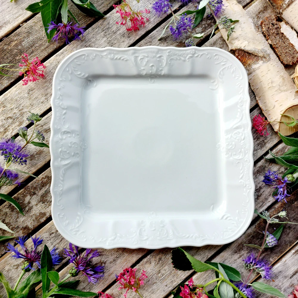 Elegantní servírovací podnos čtyřhranný v bílé barvě od největšího českého výrobce porcelánu Thun 1794. Kolekce Bernadotte je snad nejznámější a nejpopulárnější reliéfní porcelánový soubor, který se v Lesově vyrábí od 60tých let 20. století. Důkazem je, že je kolekce velmi rozsáhlá a její sortiment se neustále rozšiřuje dle požadavků trhu. Tento výrobek nemá spodní značku výrobce.