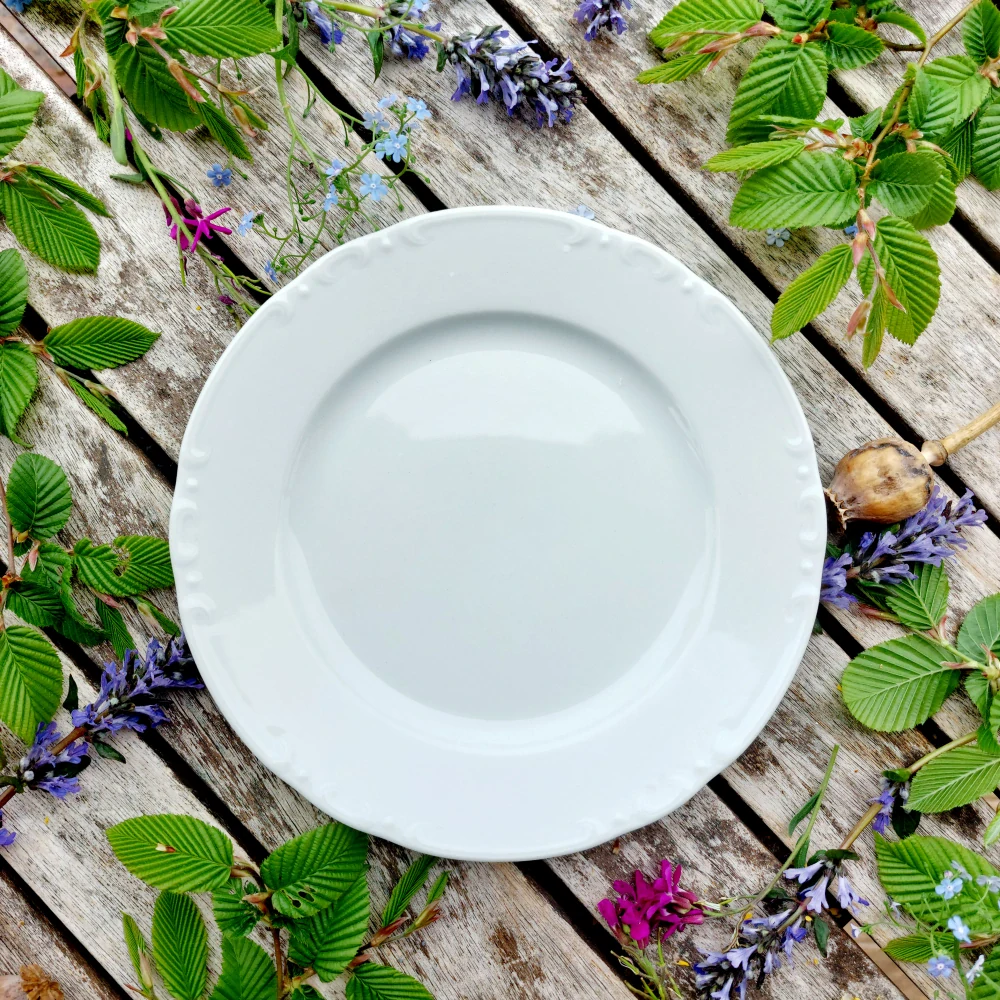 Bílý dezertní talíř z kvalitního porcelánu je ideální pro podávání zákusků, snídaní nebo drobného pohoštění. Má hladký povrch a jeho lehce zvlněný okraj připomíná květinový tvar, což mu dodává tradiční a vkusný vzhled. Okraj je zdoben drobným plastický dekorem ve formě "peciček" a plasticky vystouplou linkou, která nenápadně zvýrazňuje tvar i detaily okraje. Tento výrobek nemá spodní značku výrobce.