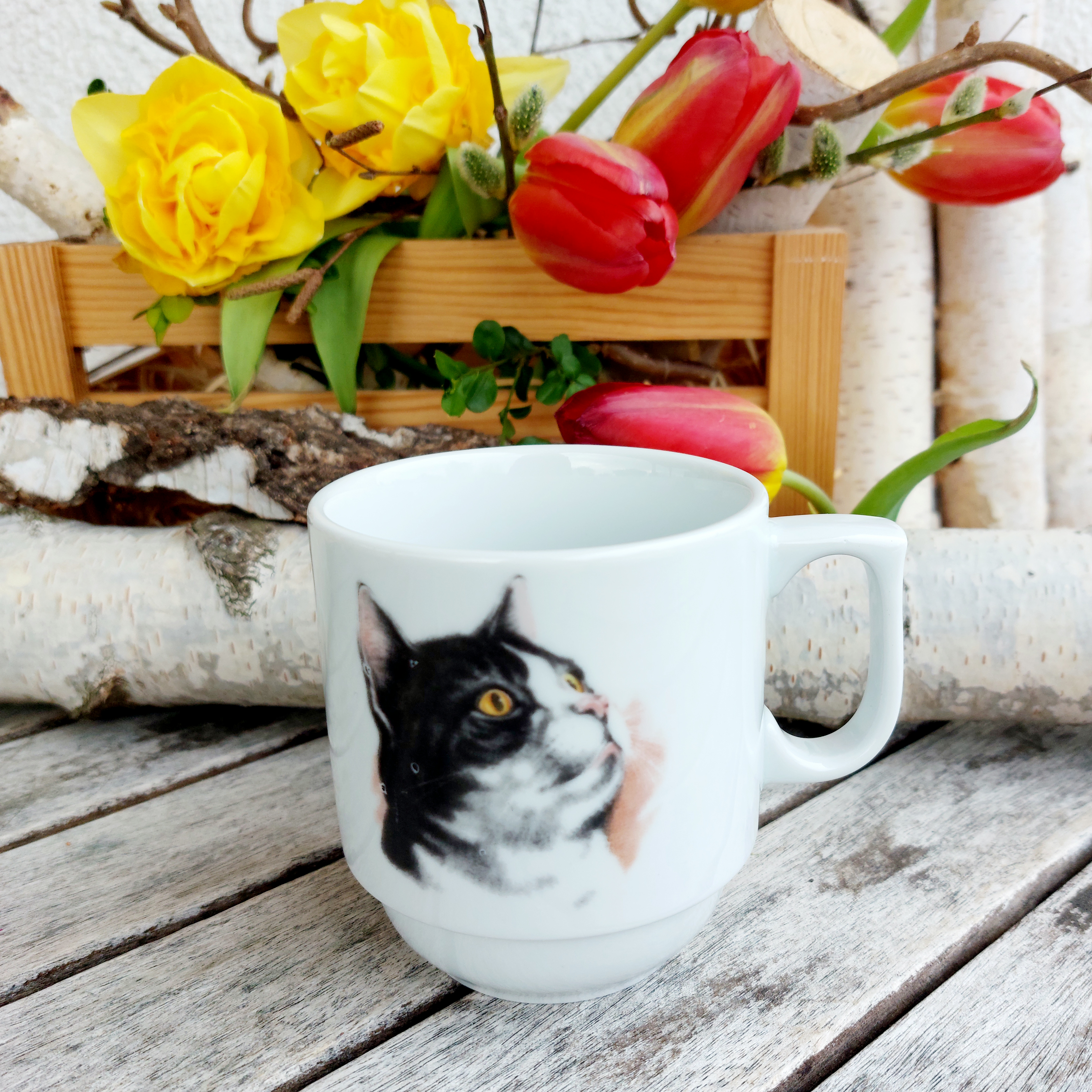 Hrneček na čaj z bílého porcelánu s dekorem černobílé kočičky. Hrnečky jsou díky svému tvaru stohovatelné, takže vám nezaberou moc místa v kuchyňské skříňce a získávají tak na praktičnosti. Je vyrobený porcelánkou Český porcelán, akciová společnost, Dubí, která je známá především výrobou pravého cibuláku.