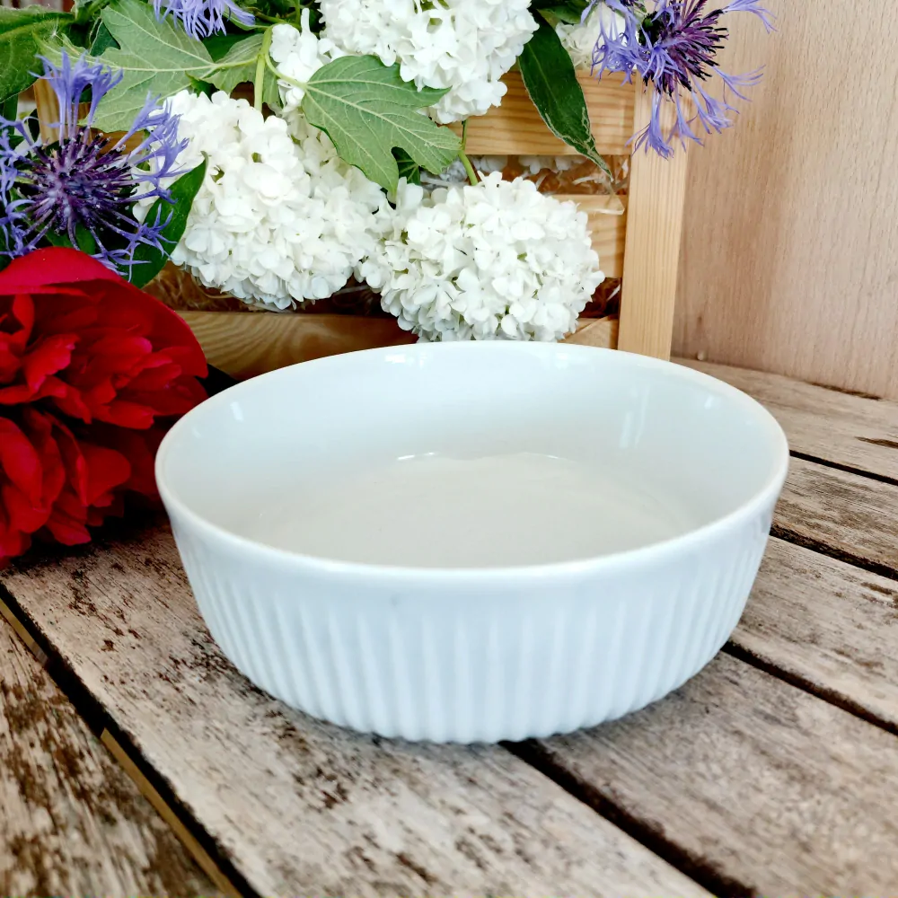 Moderní nízká miska z bílého porcelánu s žebrováním na vnější straně vhodná na polévku nebo ranní cereálie. Tento výrobek nemá spodní značku výrobce.