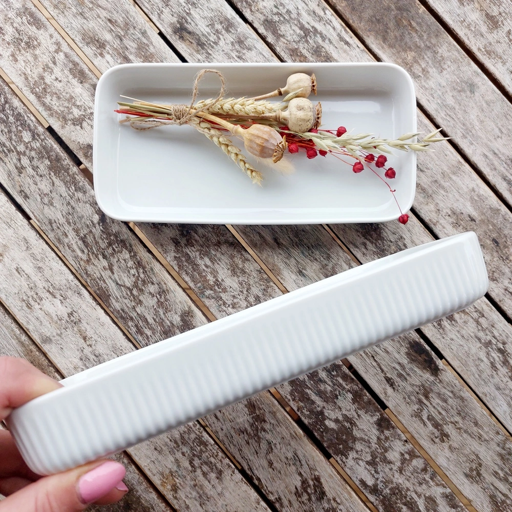 Malá nízká zapékací mísa vyrobená ze silnostěnného porcelánu v bílé barvě zdobená vroubky na vnější straně. Tento výrobek nemá spodní značku výrobce.