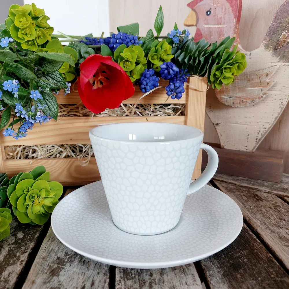 Kónický šálek s podšálkem na kávu vyrobený z bílého porcelánu z dílny nějvětšího českého výrobce prvotřídního porcelánu pro domácnosti Thun 1794. Neotřelý vzhled díky plastickému dekoru ve stylu zvířecí kůže. Díky vysoké teplotě pálení (1400 °C) zůstanou barvy ( dekorace ) trvalé i po letech užívání ( vtavný dekor ).