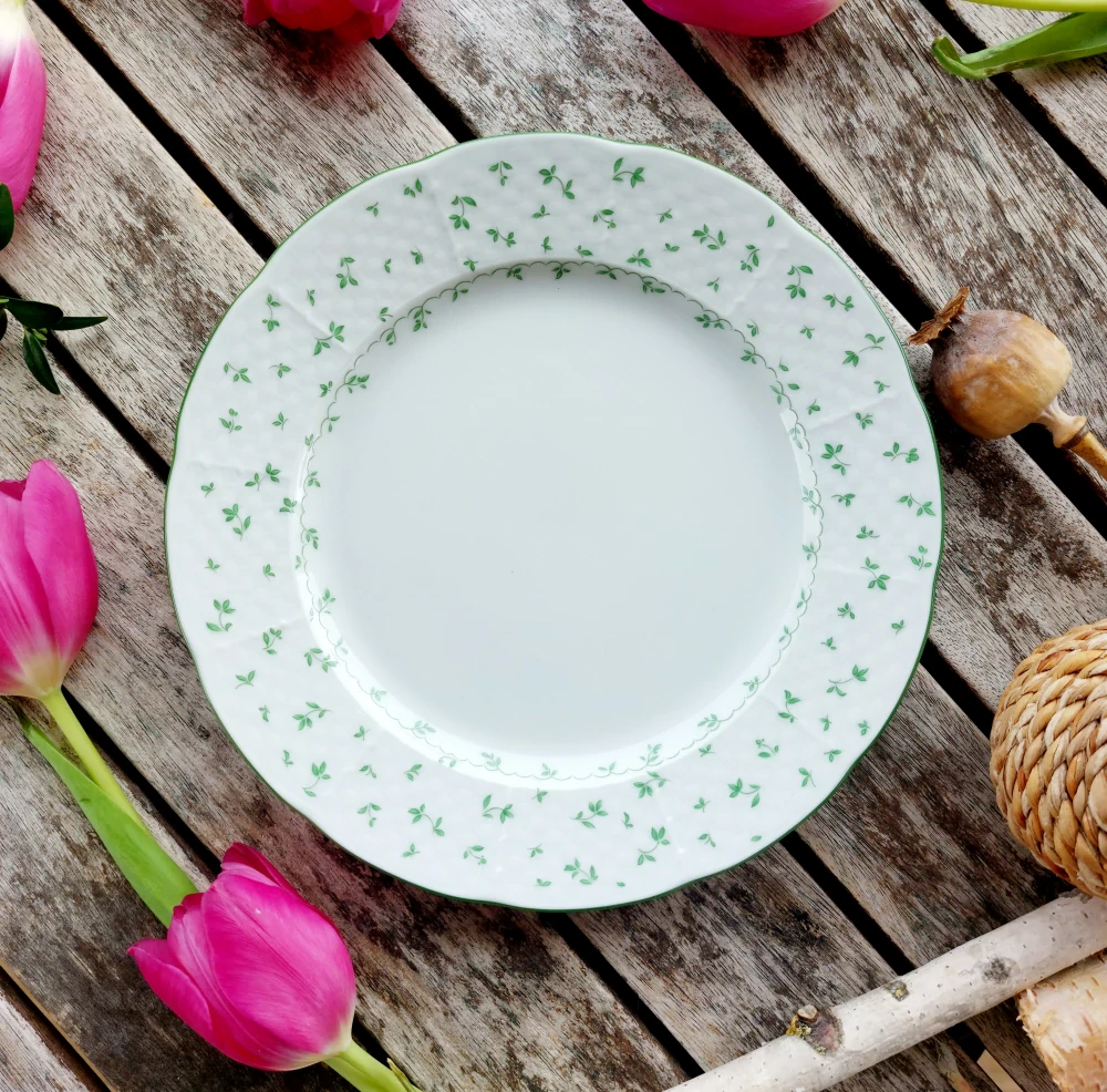 Klasický talíř dezertní vyrobený z bílého porcelánu z dílny nějvětšího českého výrobce prvotřídního porcelánu pro domácnosti Thun 1794. Jeho prapor je dekorovaný reliéfem tzv. stehem a drobnými zelenými lístečky. Díky vysoké teplotě pálení (1400 °C) zůstanou barvy ( dekorace ) trvalé i po letech užívání ( vtavný dekor ).