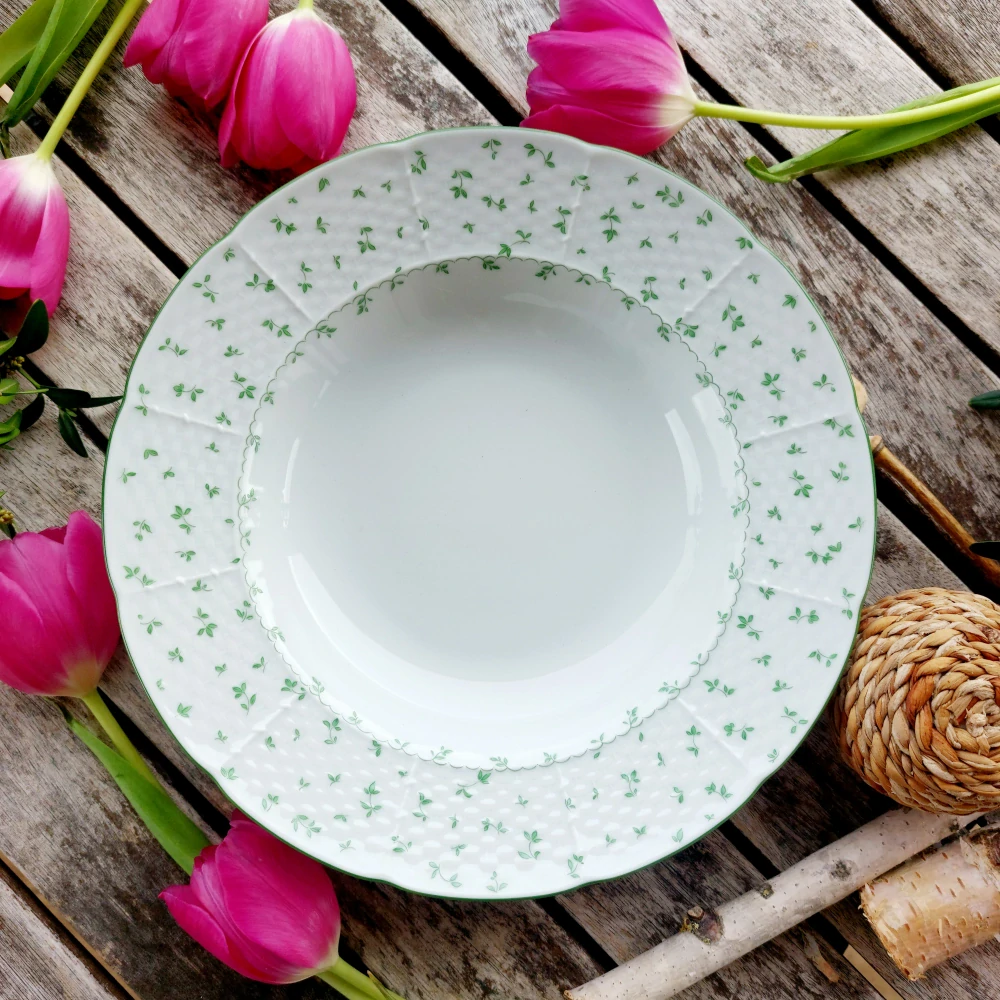 Klasický talíř hluboký na polévku vyrobený z bílého porcelánu z dílny nějvětšího českého výrobce prvotřídního porcelánu pro domácnosti Thun 1794. Jeho prapor je dekorovaný reliéfem tzv. stehem a drobnými zelenými lístečky. Díky vysoké teplotě pálení (1400 °C) zůstanou barvy ( dekorace ) trvalé i po letech užívání ( vtavný dekor ).
