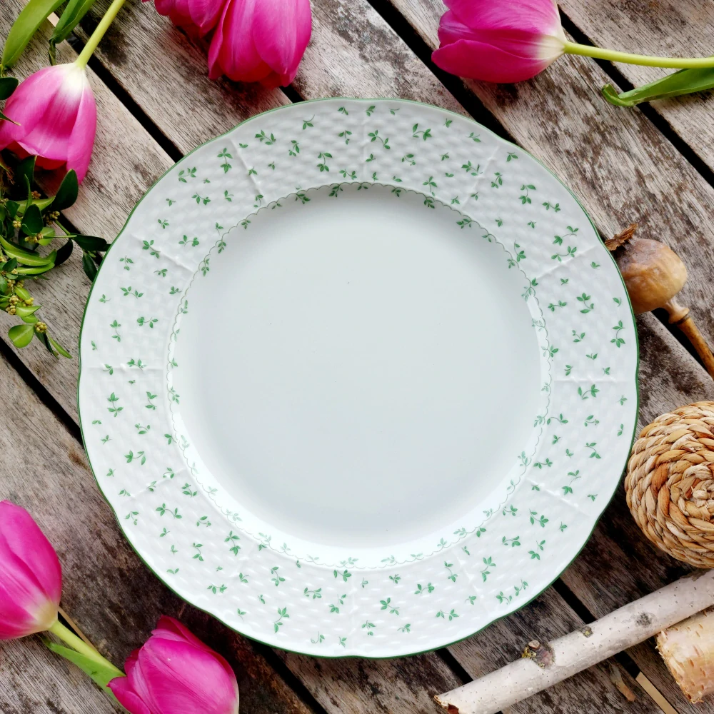 Klasický talíř mělký na hlavní chod vyrobený z bílého porcelánu z dílny nějvětšího českého výrobce prvotřídního porcelánu pro domácnosti Thun 1794. Jeho prapor je dekorovaný reliéfem tzv. stehem a drobnými zelenými lístečky. Díky vysoké teplotě pálení (1400 °C) zůstanou barvy ( dekorace ) trvalé i po letech užívání ( vtavný dekor ).