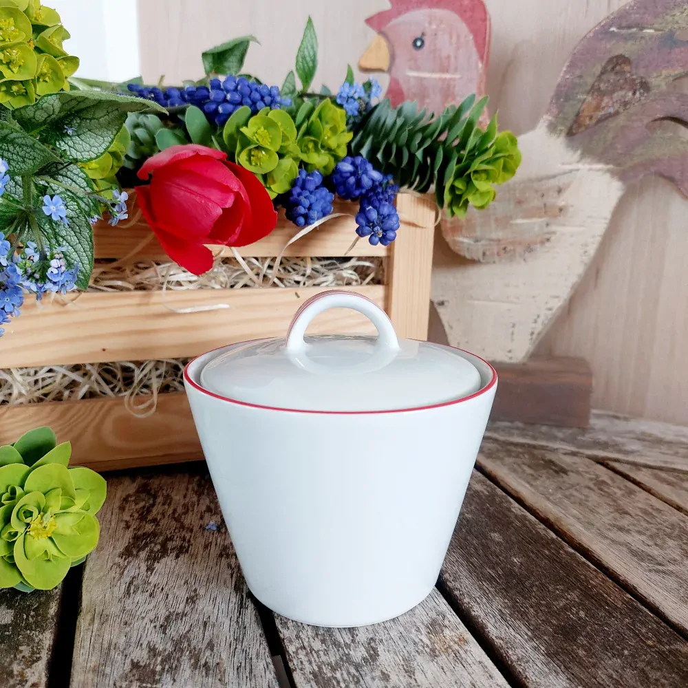 Moderní cukřenka s víčkem z bílého porcelánu dekorovaná červenou linkou. Je z dílny nějvětšího českého výrobce prvotřídního porcelánu pro domácnosti Thun 1794. Díky vysoké teplotě pálení (1400 °C) zůstanou barvy ( dekorace ) trvalé i po letech užívání ( vtavný dekor ).