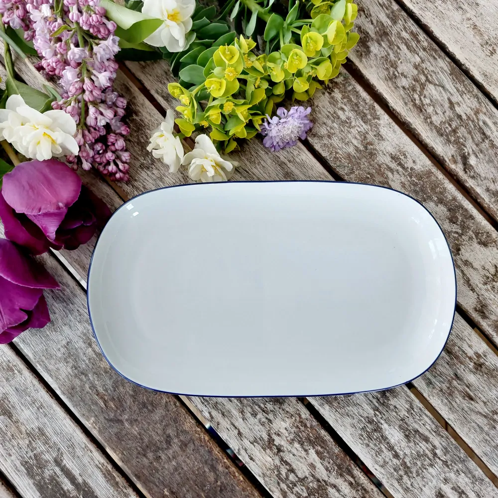 Tato plochá menší mísa oválná s mírně zvedlým okrajem z bílého porcelánu s tmavě modrou linkou na okraji je symbolem moderní elegance. Vyrobená je naším předním výrobcem porcelánu Thun 1794. Rovné linie a minimalistický design celé kolekce TOM coup z ní činí neodolatelnou volbu pro milovníky čistého a stylového vybavení kuchyně.