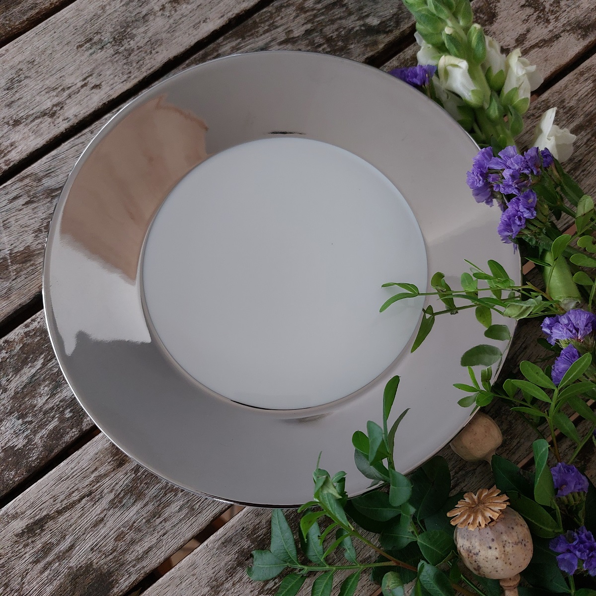Praporový talíř dezertní z bílého porcelánu. Prapor talíře má luxusní kovový vzhled. Je z dílny nějvětšího českého výrobce prvotřídního porcelánu pro domácnosti Thun 1794. Díky vysoké teplotě pálení (1400 °C) zůstanou barvy ( dekorace ) trvalé i po letech užívání ( vtavný dekor ). Tato souprava byla navržena karlovarskou výtvarnicí MgA. Lenkou Sárovou - Malískou.